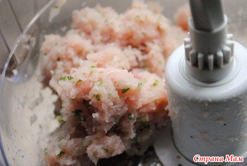 2. Тем временем готовим мясную часть. Филе курицы моем, нарезаем на мелкие кусочки и измельчаем в блендере, добавляем туда же петрушку, соль, перец, выдавливаем чеснок. Все хорошо перемалываем. Готово.