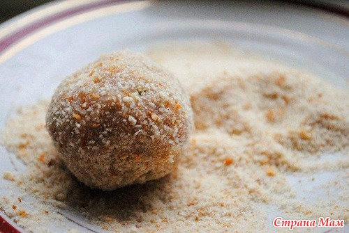 3. Теперь берем три удобные миски и в первую насыпаем муку, во вторую яйцо слегка взбитое с щепоткой соли и перца, в третью панировочные сухари. Теперь можно лепить "пончики".