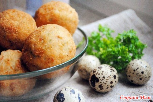 4. Очищаем перепелиные яйца. Мясную часть можно разделить сразу на нужное количество "комочков". Кусочек "теста" расплющиваем на ладони, в центр складываем перепелиное яйцо, аккуратно соединяем кончики и формируем из них шарики, обваливаем шарик в муке, потом в яйце, и в заключении в панировочных сухарях. Так проделываем со всеми, а только потом приступаем к жарке.