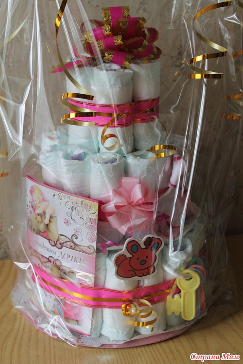 на торт для девочки ушло 48 шт. подгузников, внутри скрутила из листа плотной бумаги рулон, туда поместила масло для младенца и шампунь.