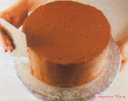 4 Шпателем нанесите крем на верхнюю поверхность заготовки и на бока. Вращая подставку, с помощью скребка разровняйте крем на боковой поверхности заготовки. Потом шпателем разровняйте крем на верхней поверхности, начиная с краев и продвигаясь к середине. Оставьте заготовку на несколько часов, чтобы она пропиталась кремом.