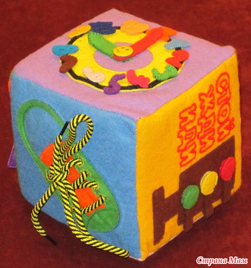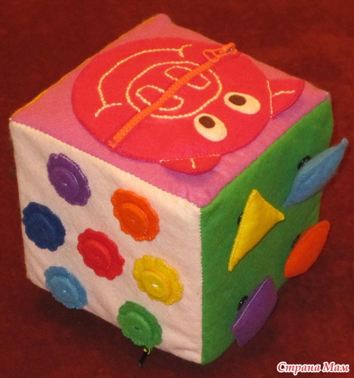 Кубик шила когда была беременной, это моя первая работа и первое знакомство с фетром. Наполнитель у кубика поролон, все остальное фетр. Размер кубика 15х15 см. Так как у меня был поролон толщиной 1 см, пришлось долго поролоновые части сшивать. Внутри поролона капсула от киндера с пуговицей и бусинками, так что кубик еще и гремит