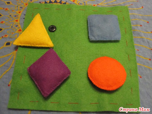 Геометрические фигуры на кнопках, в самих фигурах разный наполнитель (бусинки, шуршащие пакетики).