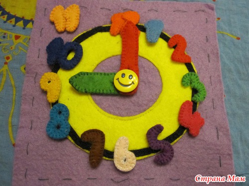 Часы, все цифры на липучке, стрелки поворачиваются. Когда ребенок начал играть я пришила все цифры, они мелковаты, может потащить в рот, он со стрелочками играется))