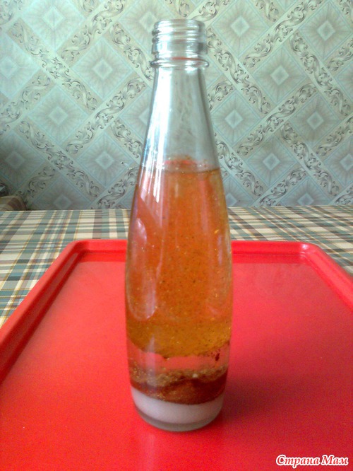 Приготовим бутылочку, в которой и будем хранить нашу заправку. Вначале засыпаем всё сыпучее.