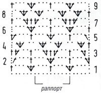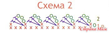 2-й р.: 3 возд. п. подъема, 1 ст. с/н в ст. с/н, 3 возд. п.. 1 ст. с/н в сред¬ний ст. с/н. * 3 возд. п., 3 ст. с/н в ст. с/н, 3 возд. п.. 1 ст. с/н в средний ст. с/н, повторять от *. 3 возд. п., 2 ст. с/н в возд. п. подъема.