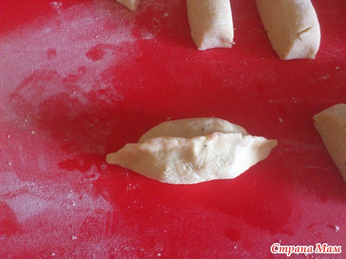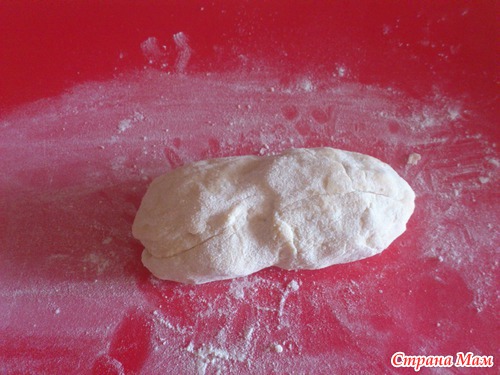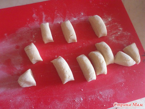 Вот тут будьте внимательны: тесто нельзя долго месить, оно затягивается и получается плотным! Так что немного подмесили и приступаем к разделке. Сначала скручиваем небольшую колбаску, потом порционно ее нарезаем: