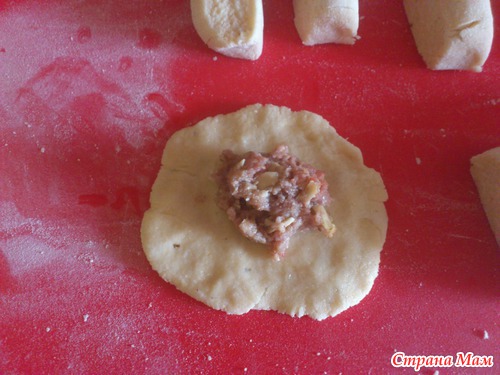 Из каждой колбаски пальцами (кому удобнее можно скалкой) разминаем блинчик. Стараемся делать его предельно тонким, кладем на него фарш: