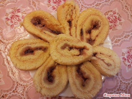 Далее достать рулет, намазать один край кремом или вареньем(у меня крыжевниковое) и горячим плотно его свернуть. Разрезать на кусочки.