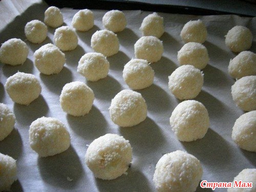 Теперь сформировать шарики с грецкий орех и уложить на пергаментную бумагу.