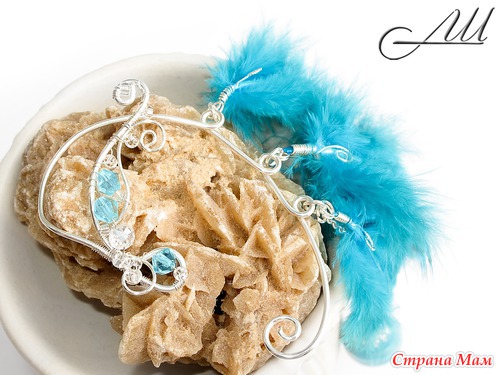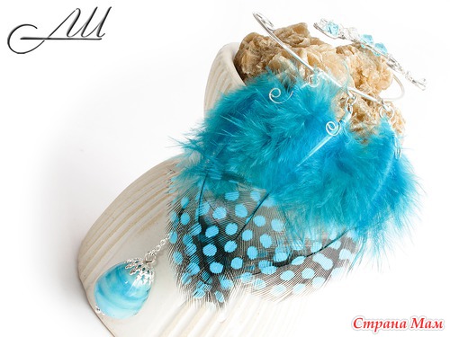Кафф выполнен из посеребрённой немецкой проволоки с испольгованием стеклянных чешских бусин, чешского бисера, перьев цесарки, металлической цепочки под серебро и бусины лэмпворк авторской ручной работы В. Золототрубовой