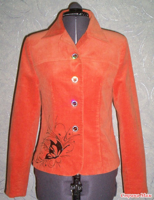 Сшила обычный пиджак. Носила с удовольствием, но захотелось чего-то интереснее. Придумала вот такой декор. Бабочка выполнена из искусственной кожи, остальное дорисовано акриловыми красками. Читать полностью
