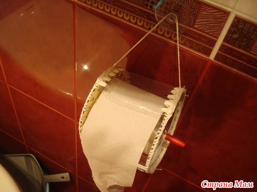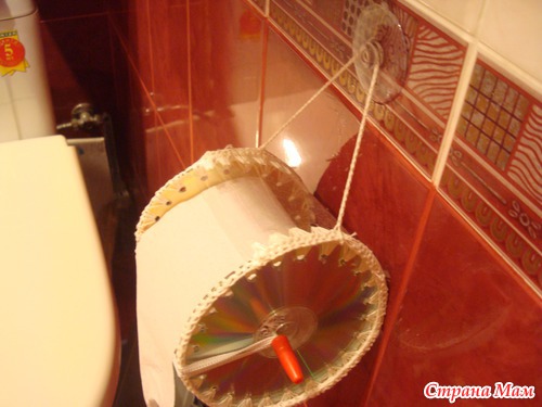 На дисках по кругу я сделала дырки паяльником, обвязала крючком нитками "ирис". На серединке от пластиковой бутылки дырки сделала дыроколом, тоже обвязала. Потом соединила также нитками и крючком обвязанные диски и пластик. Длина круга дисков оказалась больше, чем длина пластика и в оставшееся пространство легко помещается рулон туалетной бумаги. А чтобы было легко и удобно его крутить, я взяла короткую спицу и вставила в имеющиеся дырки от CD посерединке. А чтобы спица не выпадала и, чтобы не соткнуться однажды невзначай, я взяла 2 колпачка от шариковых ручек, вставила в них ластики от простых карандашей и воткнула спицы. Теперь спица зафиксирована с обеих сторон, безопасна и крутится очень легко.
