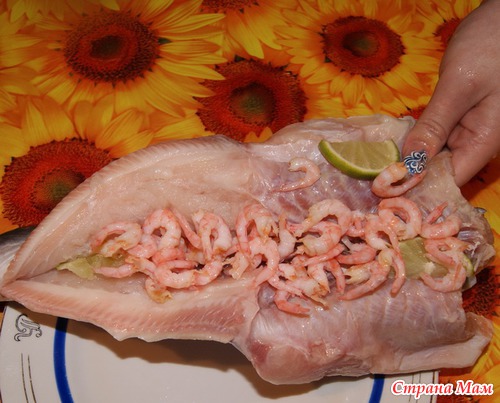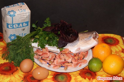 Апельсин и лайм нарезаем полукольцами, креветки очищаем от панциря. Далее начиняем рыбу лаймом, креветками, апельсинами и веточками зелени. Теперь готовим соляную массу, смешивая белки и соль. Выкладываем часть получившейся массы на противень, соответственно длине и ширине рыбины.