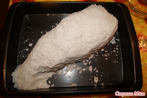 Кладем на соль рыбу и обмазываем остатками массы, делаем как бы панцирь. Ставим нашу рыбку в духовку на час, при температуре 200С.
