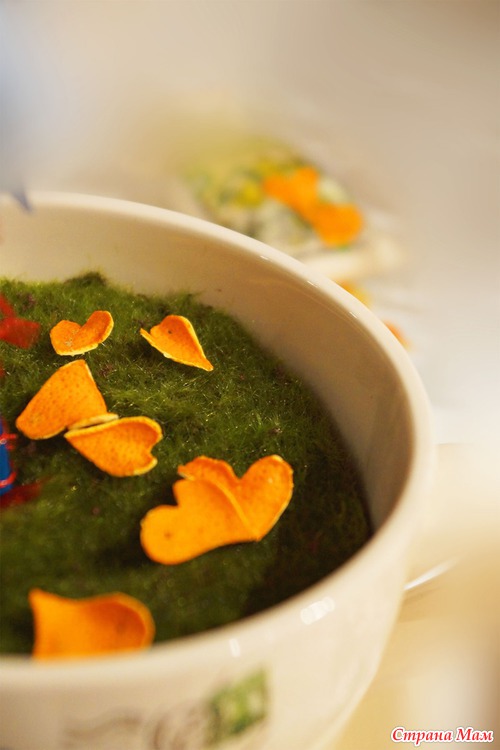 Деревце 22 см высотой вместе со стволиком, стволик - веточка покрашенная акриловыми красками, обратная сторона кроны - флис расшитый паетками и бисером, в кашпо крепится в пенопласт, сверху искусственный мох, к сожалению настоящего и зеленого не нашла в магазинах нашего города, а в лес меня не выпустили, да и жалко живой!