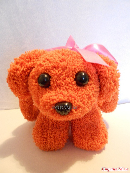 , но вязать из такой пряжи крючком очень трудно! Вот и решила я связать свою спицами! Голова-шар, туловище в виде трубы, потом согнула пополам и пришила к донышку, лапки вязала как пинетки, глазки-это большие бусинки, носик покупала в магазине и приклеила! Пряжа "Кроха", ушло 4 шт.