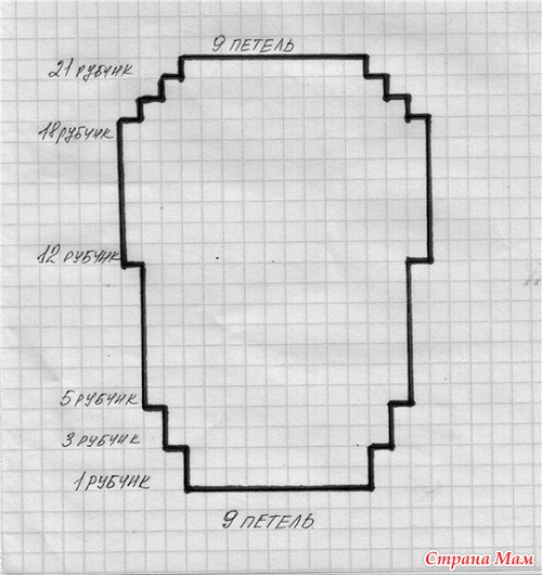 Набрать 9 петель и вязать платочной вязкой прибавляя и убавляя согласно схеме. Должно получиться 21 рубчик (1 рубчик-2 ряда). Можно закрыть или оставить петли открытыми