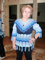Очень нравятся мне узоры "Миссони": зигзаги, волны, сложные нахлесты и прочие их особенности. Вот в этой кофточке использовала самый простой из них: лицевые ряды - *5 лиц., 3 вместе лицевой (средняя петля - сверху), 5 лицевых, 1 накид, 1 лицевая, 1 накид*. Изнаночные ряды - все изнаночные петли. Спицы - круговые, № 2,5.