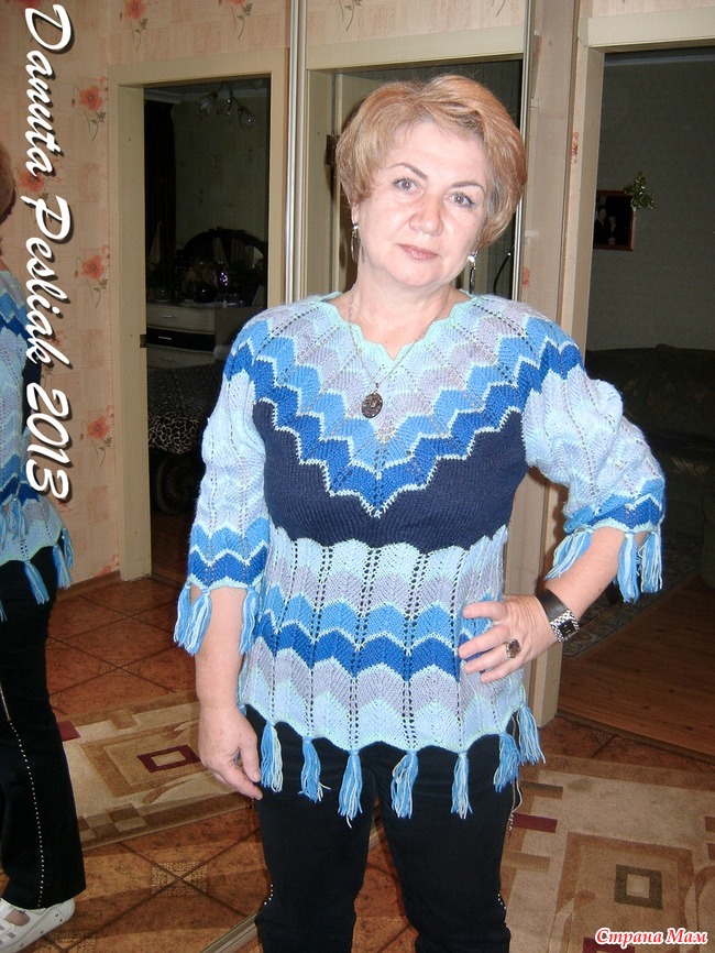 Рукав -3/4, тоже связан основным узором. После достижения нужной длины петли закрываются. Завершением стали кисточки на каждом выпуклом уголке зигзага.
