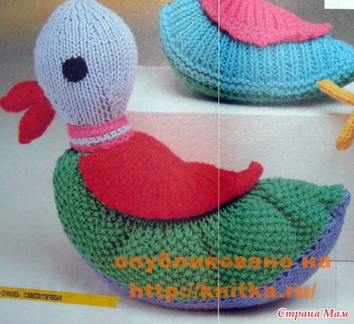 Голова: набрать нитью цвета лаванды на 4 сп. по 3 п. и вязать 3 круг. р. лиц. гладью. Прибавления выполнять, как для большой утки, пока на спицах не окажется 4 х 9 п. 8 р. вязать прямо, затем в каждом 2-м р. выполнять убавления, как для большой утки, пока на спицах не останется 4 х 5 п. Еще 8 р. вязать без убавлений, закрыть п. Детали сшить, как для большой утки, и набить. Бортик: связать ярко-розовой нитью цепочку из 55 в. п. и вязать 1 р. ст. б/н, затем 1 р. * 1 ст. б/н, 3 в. п., пропустить 1 п., повторять от*.