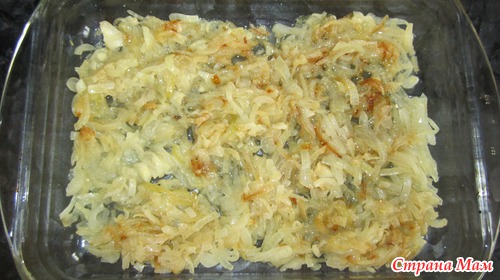 В форму для запекания выкладываем заранее обжаренную половину лука