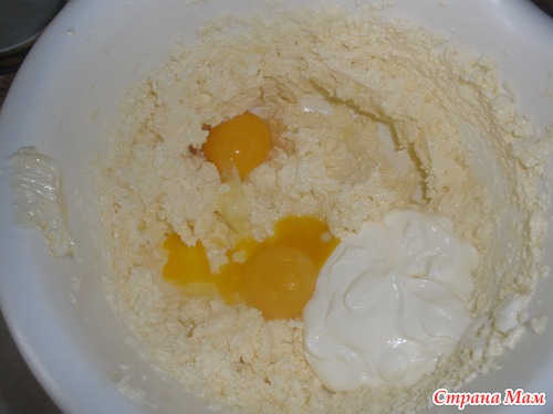 Мягкое масло взбить до пышности с сахаром, добавить желтки, сметану.
