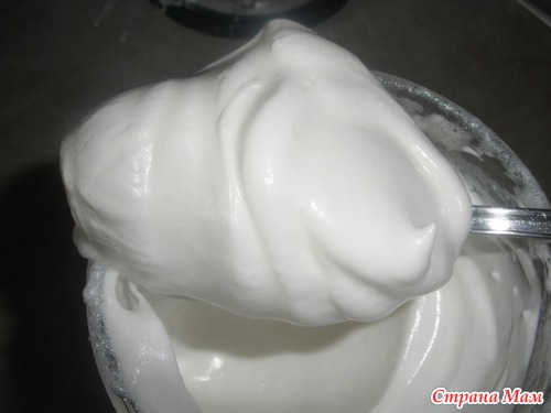 Белки взбить до увеличения в 3-4 раза и легких пиков. Продолжая взбивать, порциями добавить сахар.