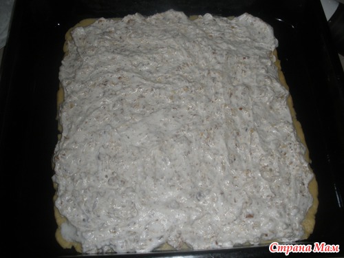 Одну часть теста раскатать толщиной 0,4-0,5 см на бумаге для выпечки или сразу на противне. Выложить сверху начинку и распределить ее до края теста.