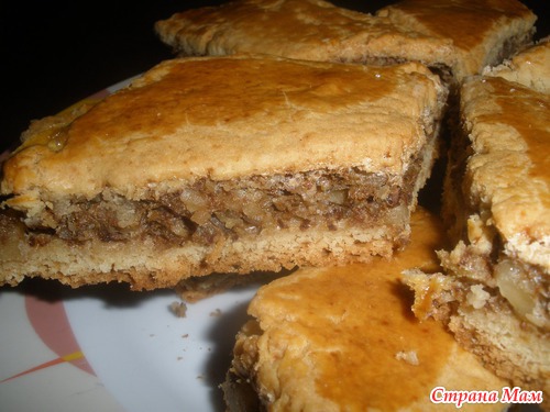 Разрезать пирог на квадраты или ромбы ( не прорезая нижний слой теста), смазать желтком и печь в разогретой до 180 градусов духовке - 25-35 минут, до зарумянивания.