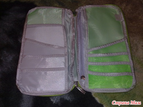 Жаль только, что цвет не красный, но если бы не устраивал этот вариант, то конечно бы я не стала его заказывать.В раскрытом виде. Много всяческих кормашков, есть отделение на молнии.