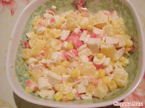 Вначале порезала совсем чуть апельсина и крабовых, посолила, добавила майонеза, перемешала... попробовала... неплохо... но таки правда... чеснока и кукурузы не хватает