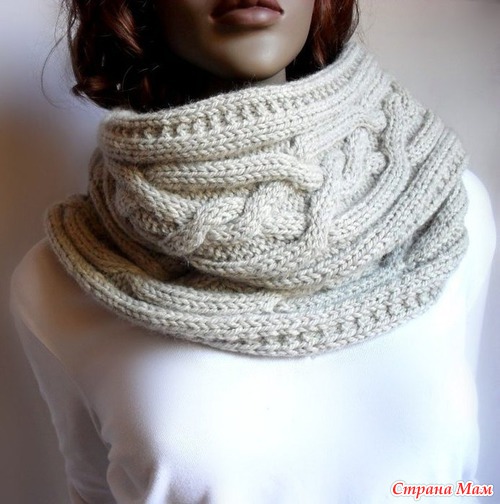Суть такая: вяжется длинный шарф, который потом сшивается вместе в кольцо (вертикальный шов)., как снуд.