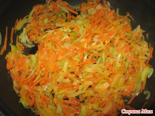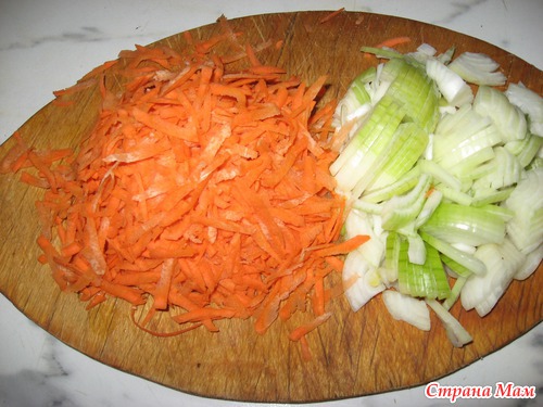 Лук измельчить, морковь потереть на крупной терке..