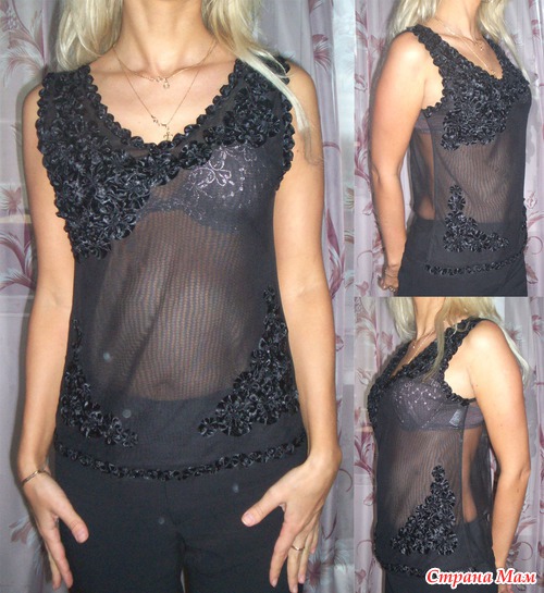 Майка из сетки, на ней нашиты цветы из атласных лент.