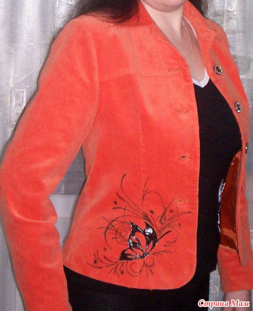 Сшила себе пиджак из корда, яркий, красивый, но что-то не хватает, оформила декор из искусственной кожи и акриловой краски