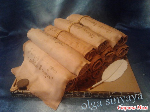 Цитата заказчика "Идея жены юбиляра (моего сына), в честь которого и заказывался торт. Это свитки-книга Ога Мандина "Величайший торговец в мире" - одно из любимых произведений юбиляра".