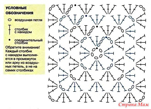 Стандартный квадрат состоит из воздушных петель и столбиков с накидом. «Кружочки» на схеме – это воздушные петли, а «палочки» - столбики с накидом. Не обязательно вязать в 4 ряда (как на схеме) можно и 6 и больше, все ряды вяжутся аналогично.