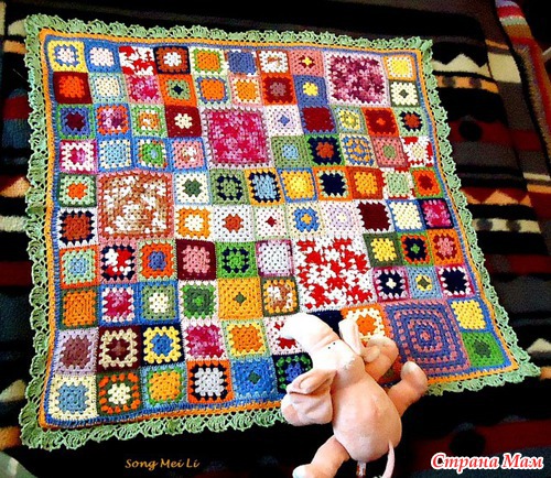 Каждый квадрат закрепить булавками и отутюжить (см. с. 18). Сложив лиц. сторонами вместе, крючком толщиной 3 мм и нитью D соединять квадраты ст. б/н (см. с. 18). Сделать ленты по 8 квадратов (по длине одеяла), затем вязать рядами, соединяя между собой ленты.