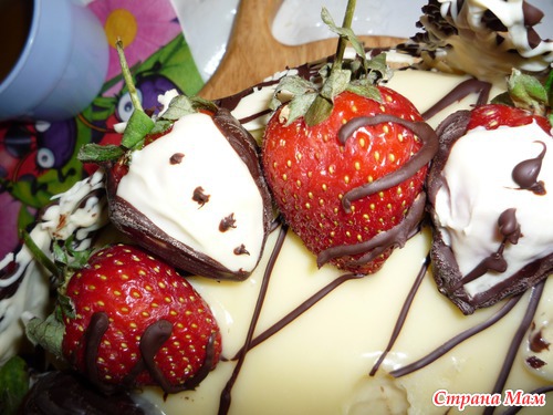 Шоколента пострадала от помощников. Так что видок у тортика тот еще. Клубника во "фраках" тоже результат совместного творчества. Тортик на первый полуюбилей (5 лет) для сынулика. Крема вышло маловато. Впитался весь, а хотелось почувствовать его между коржами. В след. раз удвою рецептуру. Но смели быстренько. Конечно клубника ушла первой.
