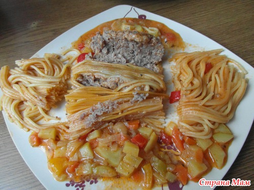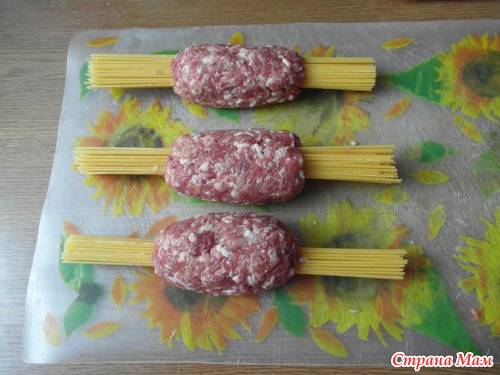 -небольшое количество спагетти оборачиваем фаршем по центру...