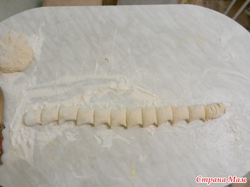 Скатываем пласт в рулет и нарезаем кусочками шириной 4-5 см...