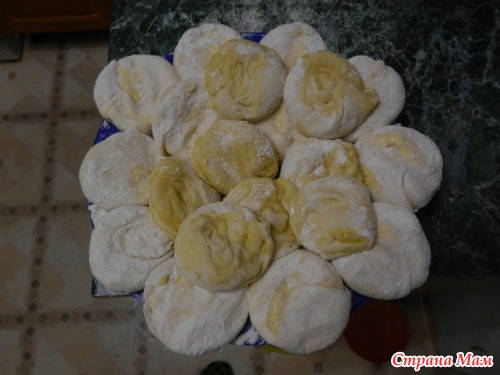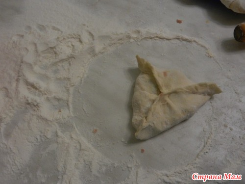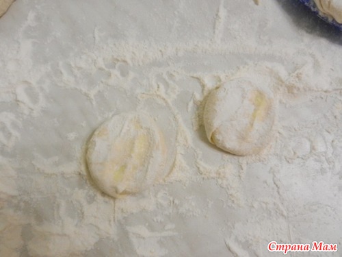 Затем, как на пельмени, сплющиваем в муке эти кусочки