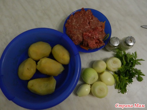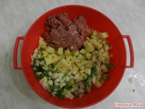 А, тем временем, займёмся начинкой, очистить и нарезать кубиками (как на салат) сырой картофель, нарезать лук, чем больше, тем сочнее начинка получается, добавить мясной фарш, зелень (я кладу только петрушку, можно и кинзы положить, на любителя), посолить, поперчить для аромата и пикантности чёрным перчиком, для сочности ещё добавляю кусочек сала, когда кладу начинку или масла подсолнечного ко всему фаршу. Ещё я делала начинку из ветчины (куриной) и сыра, ветчину резала кубиками, а сыр натерла. Дети съели, даже попробовать не успела!)))