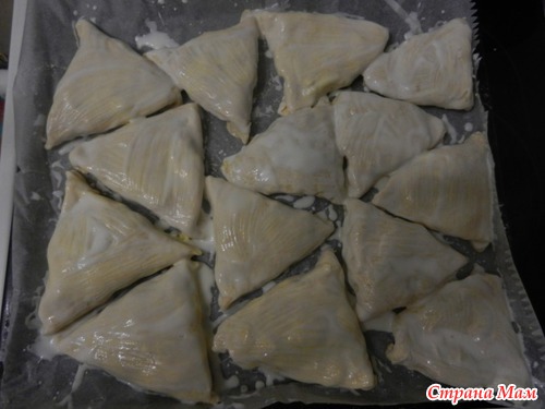Выстилаем противень пергаментной бумагой, с ней меньше пригорает самса, и проблем с вытекающим маргарином. Выкладываем нашу самсу защипами вниз, смазываем... кефиром! Выпекаем на 180 градусах до зарумянивания корочки, минут 35-40.