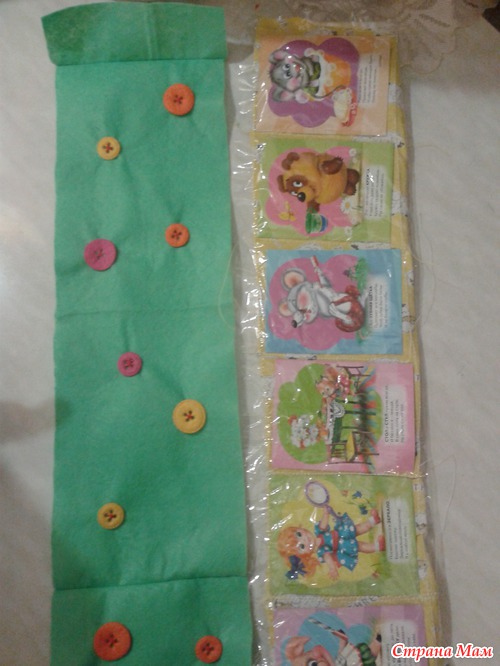 Для домика приготовила вырезанные странички из книжки. Сшила 2 детали-наружная и внутренняя. Во внутренней стороне под клеенкой пришиты картинки. Наружная украшена пуговицами из фетра