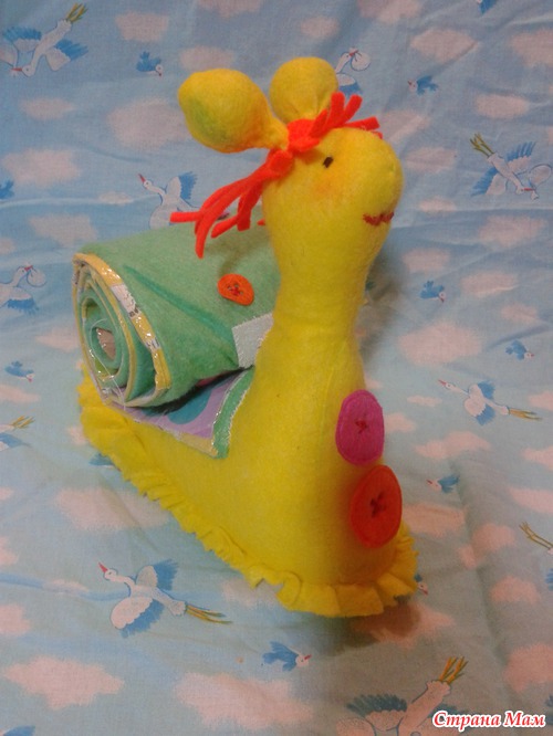 Улитка готова!!! Она приятно гремит, если ее потрясти. Деткам нравится сворачивать и разворачивать ее необычную раковинку