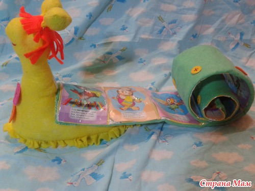 Детали вместе сшила. Пришила к улитке. В месте соединения улитки и ее книжного домика пришила липучую ленту.