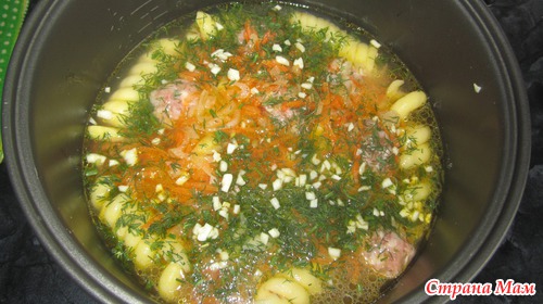 На дно мульти выложить чуть чуть овощей, на них укладываем картофель, сверху оставшиеся овощи. Залить горячей или теплой водой, посолить, лаврушка, зелень, чеснок мелко порезать, приправа на ваш вкус. Мы бульончик любим, поэтому вода у меня скрыла картфель.