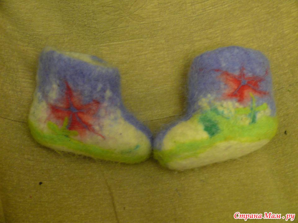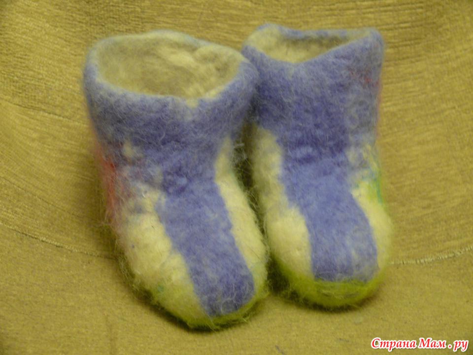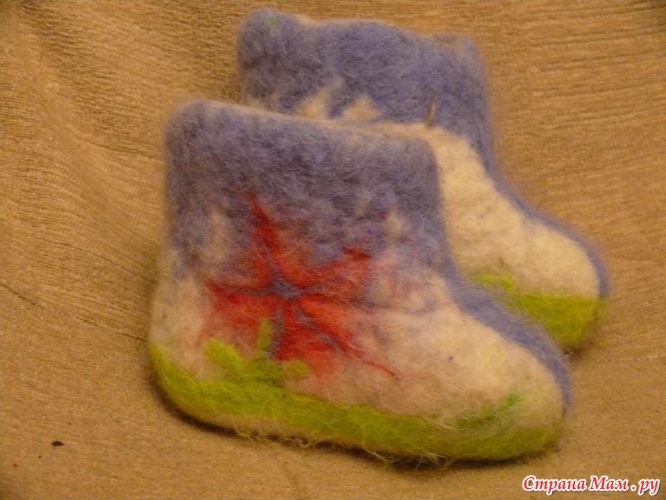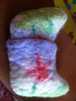 Потом я пришила на подошву еще слой войлока (у меня был не помню от чего уже) и подваляла иглой. Фотографий нет. И мы сегодня пошли гулять в них. Пришли, а ноги были холодные